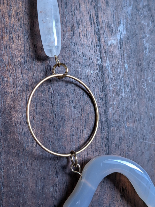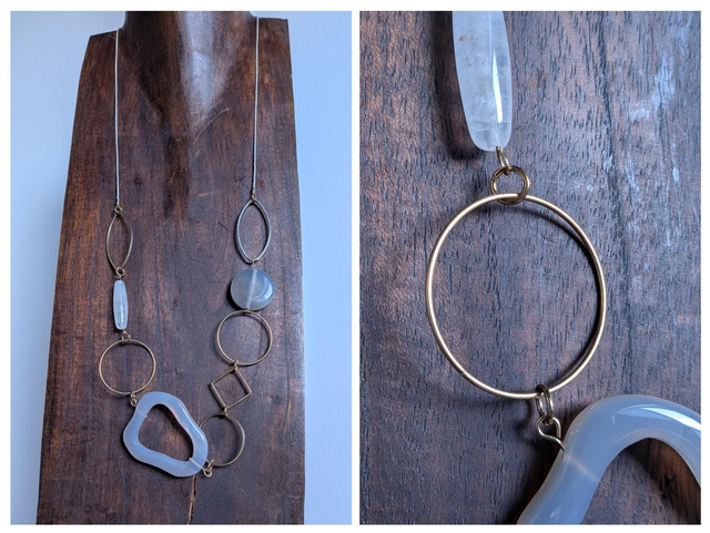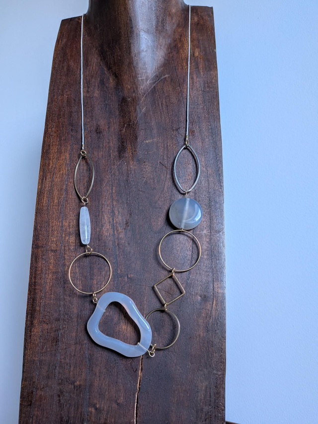 Agate grise et pierre de lune ( pierres naturelles), cercles bronze sautoir monté sur fil de lin réglable et résistant, pièce unique