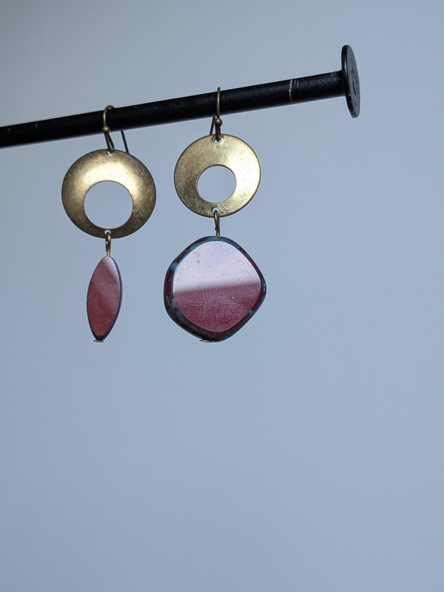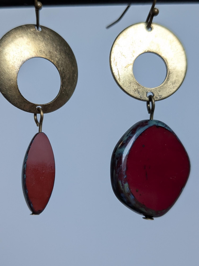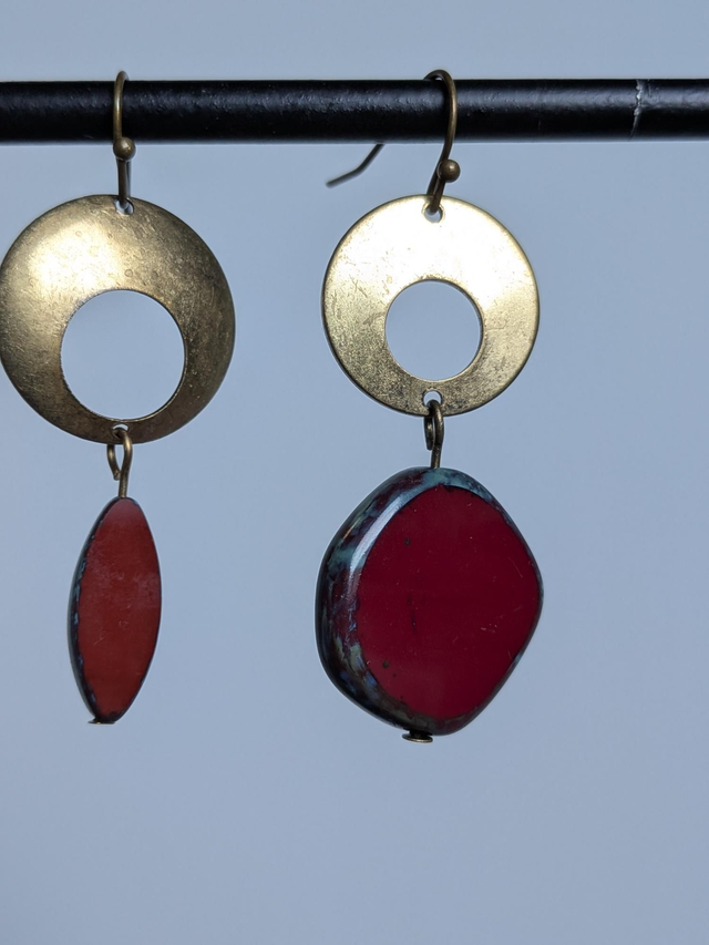 Asymétrie pour ces boucles originales rouge brique en laiton bronze -sans nickel, pièce unique