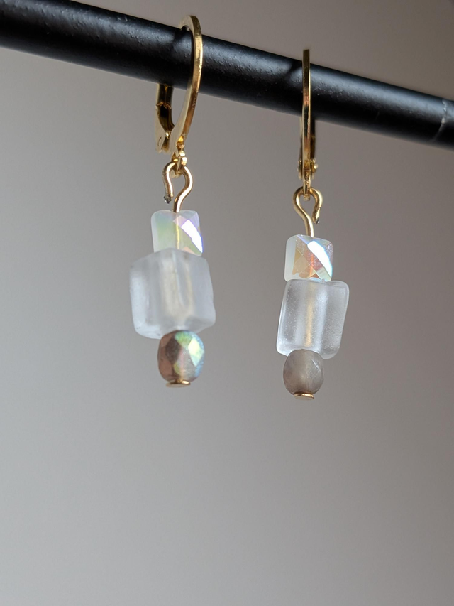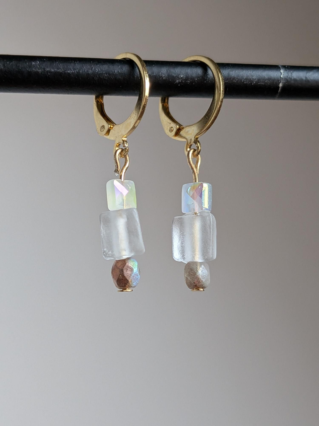 Boucles cube verre transparent et blanc nacré, acier inoxydable doré -sans nickel, pièce unique