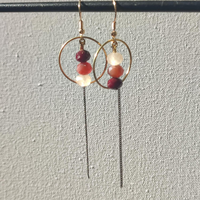 Boucles d'oreilles 3 perles en verre brun, orange, bordeaux et cercle