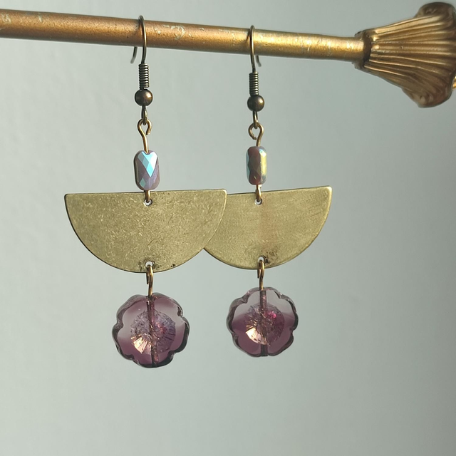 Boucles d'oreilles demi cercle et fleurs en verre violine et or , laiton bronze, pièce unique, sans nickel