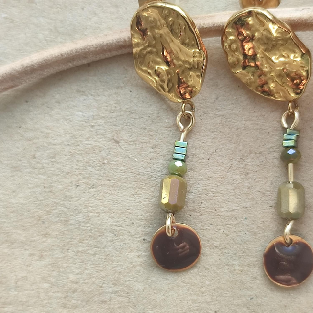 Boucles d'oreilles email brun et verre kaki , acier inoxydable doré -sans nickel
