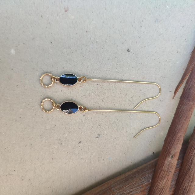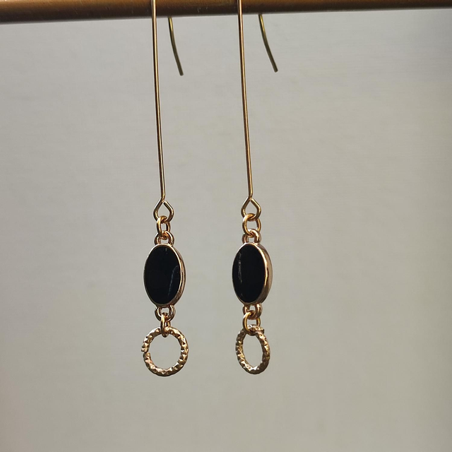 Boucles d'oreilles email noir & cercles ciselés sur tiges en acier inoxydable doré -sans nickel, pièce unique