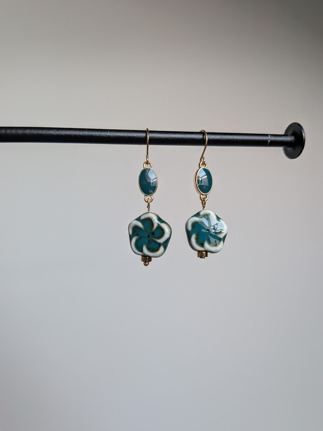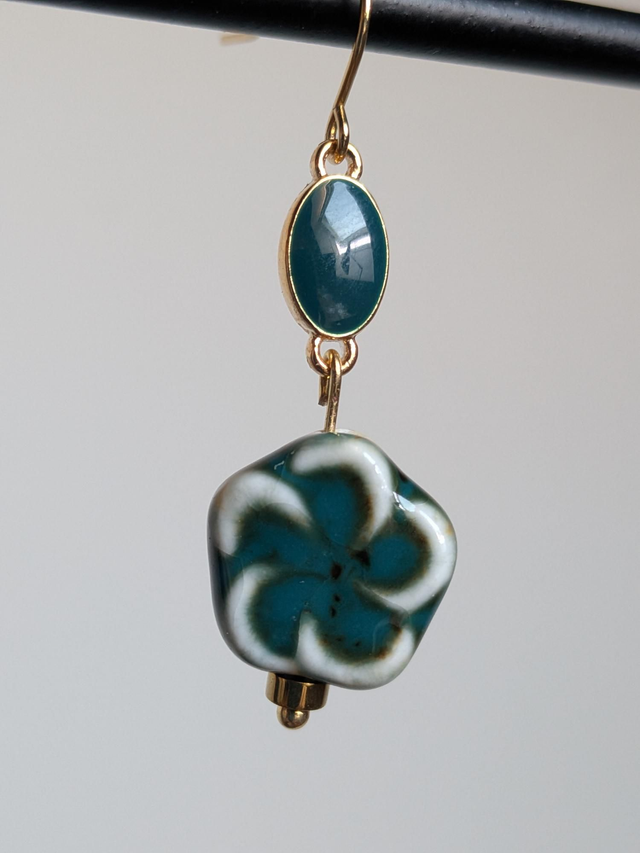 Boucles d'oreilles " fleurs" en verre blanc et vert et email, en acier inoxydable doré, pièce unique, sans nickel