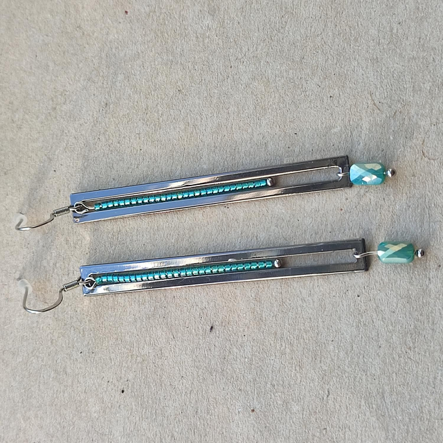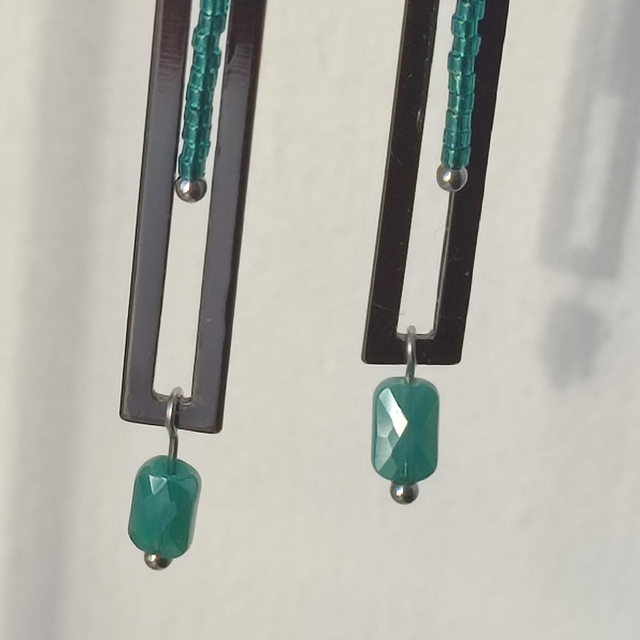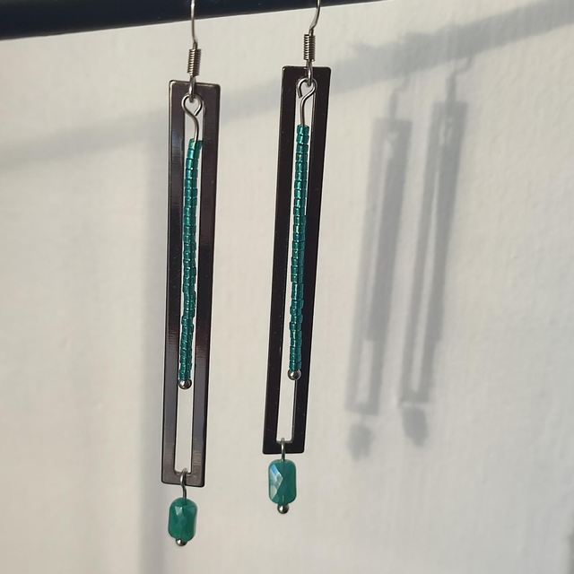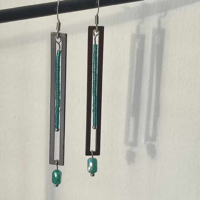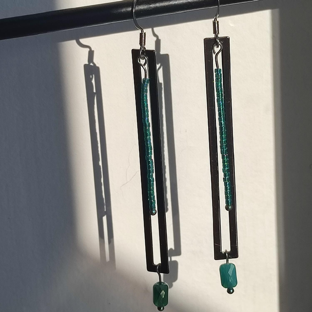 Boucles d'oreilles longues noir et verre turquoise, acier inoxydable argenté, pièce unique sans nickel