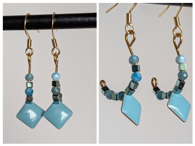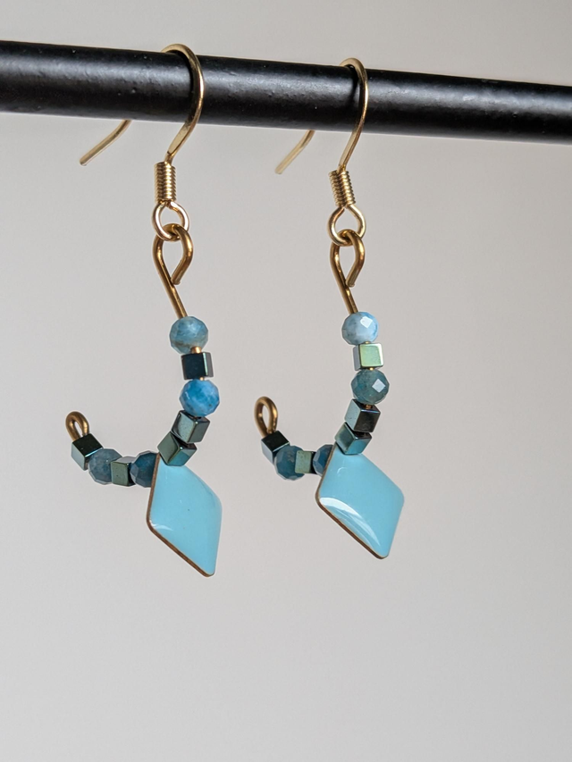 Boucles demi cercle email bleu et perles en pierre naturelle et hématite bleu en acier inoxydable doré -sans nickel