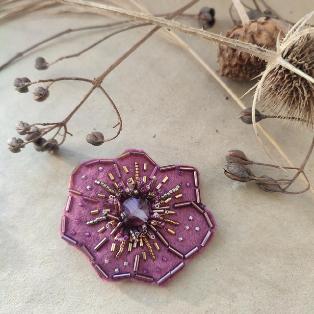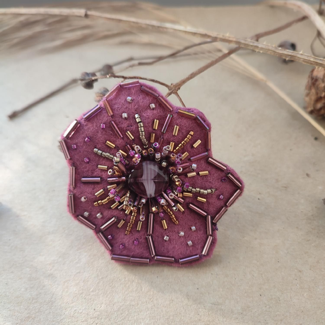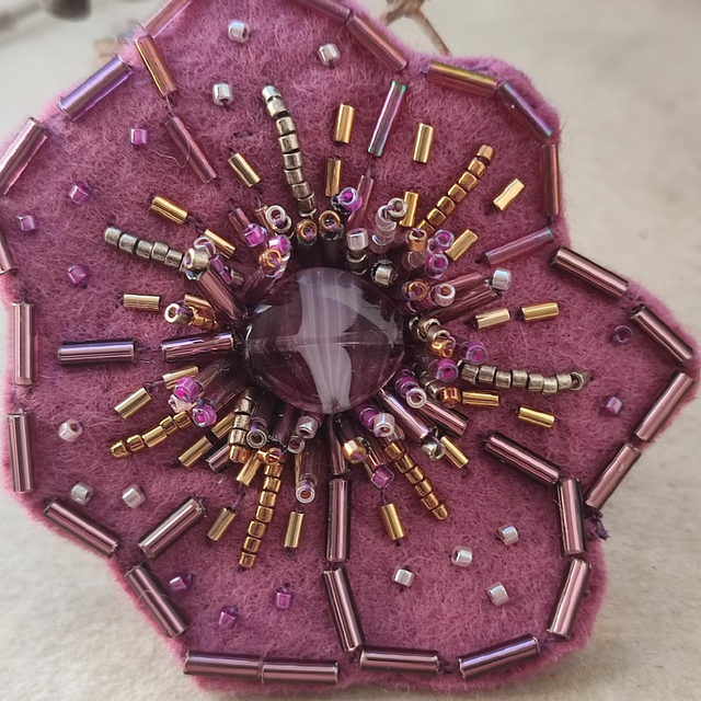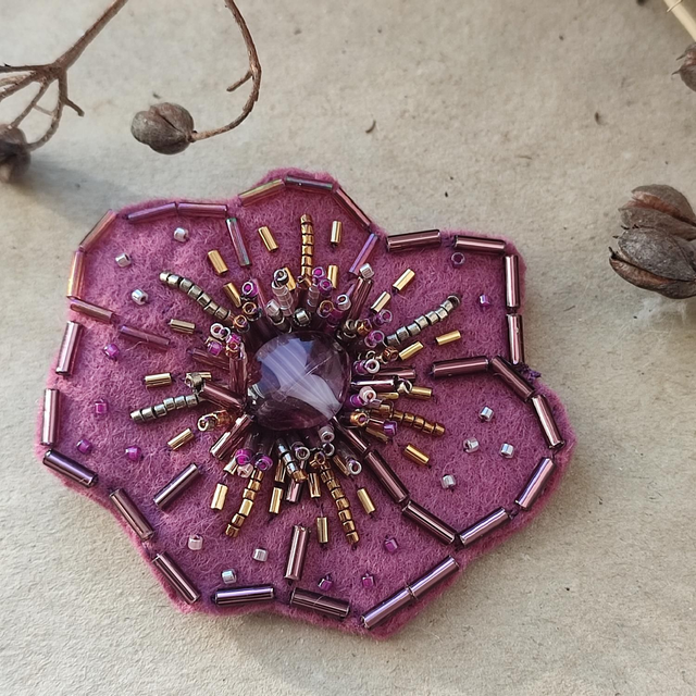 Broche fleur tissée main, feutrine et perles en verre, pièce unique