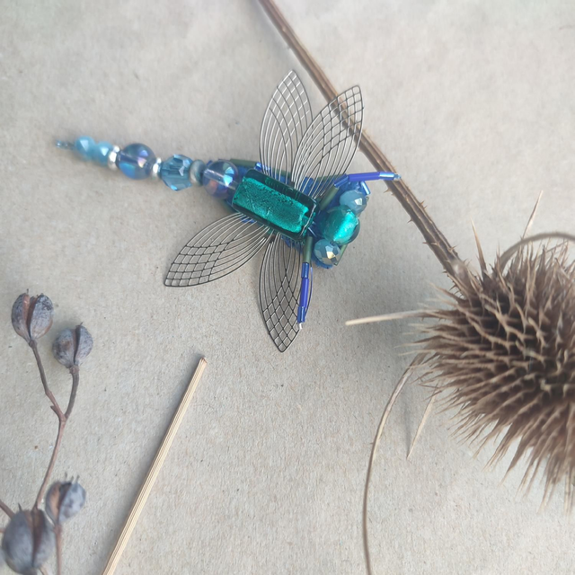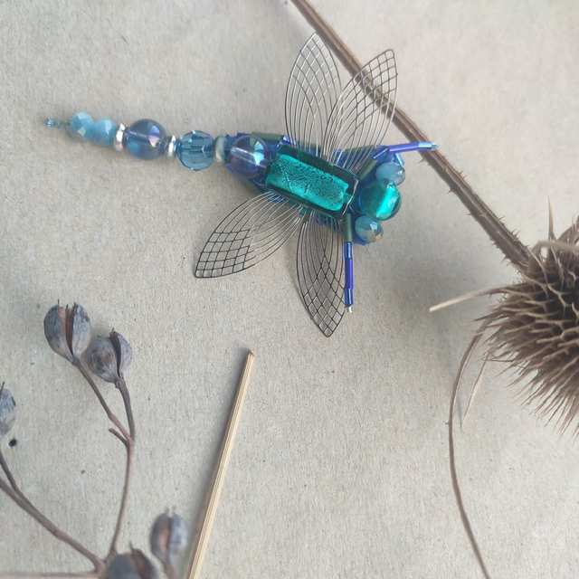 Broche " libellule" en perles de verre turquoise et argent, tissé main, pièce unique