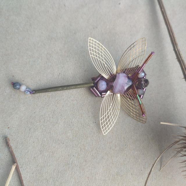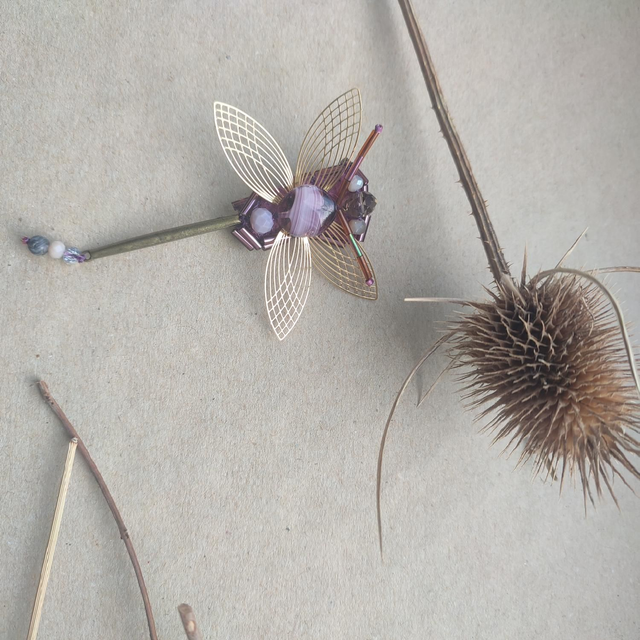 Broche libellule violine et bronze et or, tissé main en pièce unique