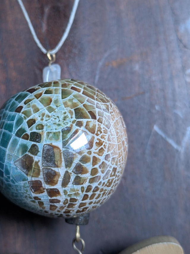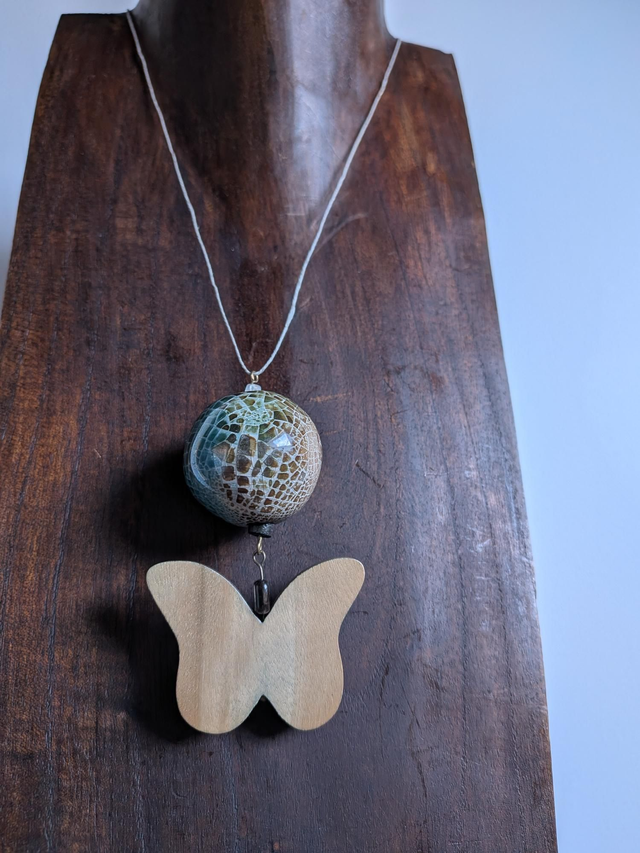 Céramique grecque : bleu, beige,brun, aux jolis reflets et papillon 🦋 en bois de noyer, monté sur fil de lin réglable, pièce unique