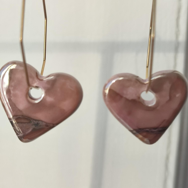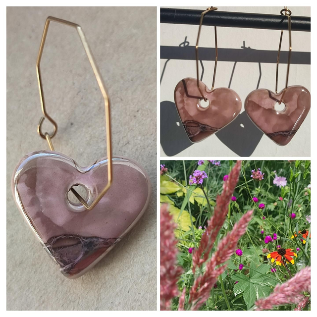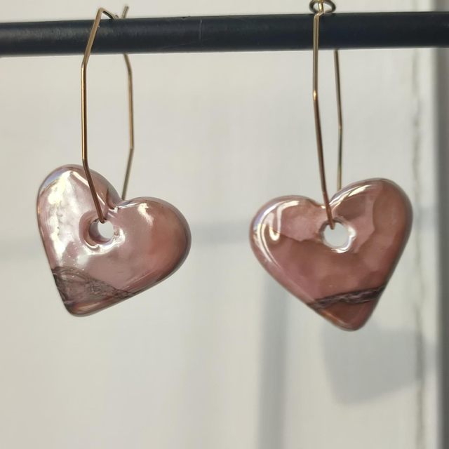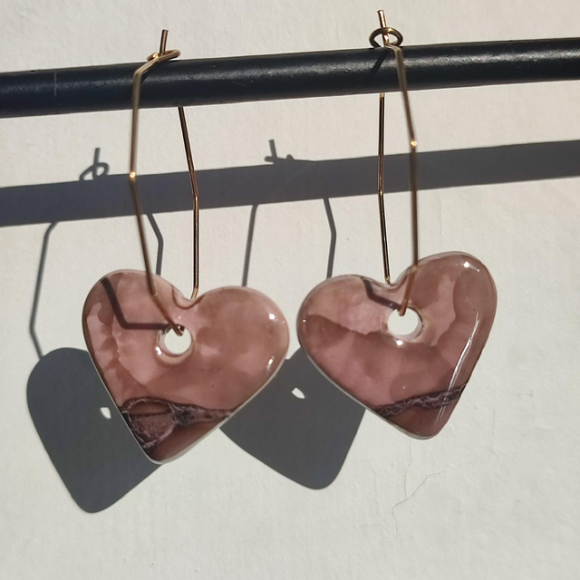 Coeurs en céramique aux jolis reflets sur créoles hexagonales en acier inoxydable doré -sans nickel, pièce unique