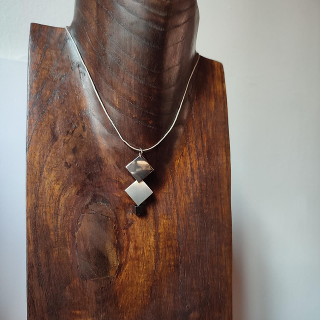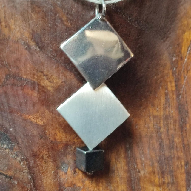 Collier carrés argentés et cube en hématite noire ( pierres naturelles)monté sur fil de lin, chaîne d'extension