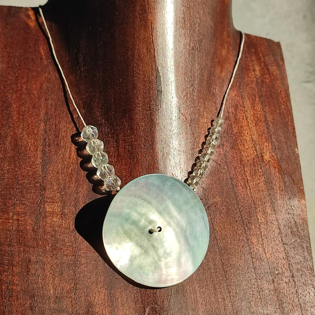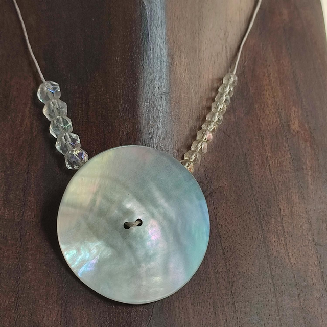 Collier en nacre et perles de verre transparent monté sur fil de lin réglable avec chaîne d'extension, pièce unique