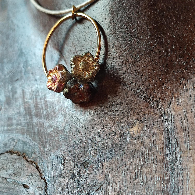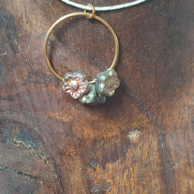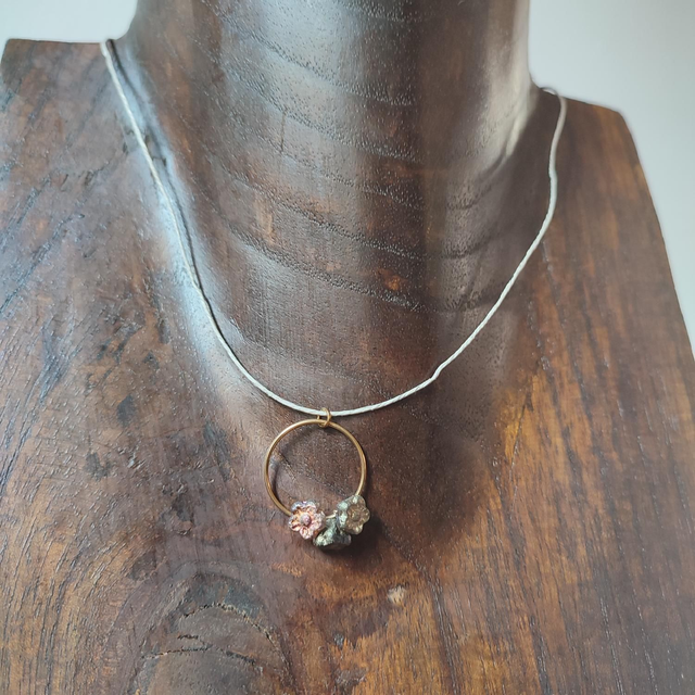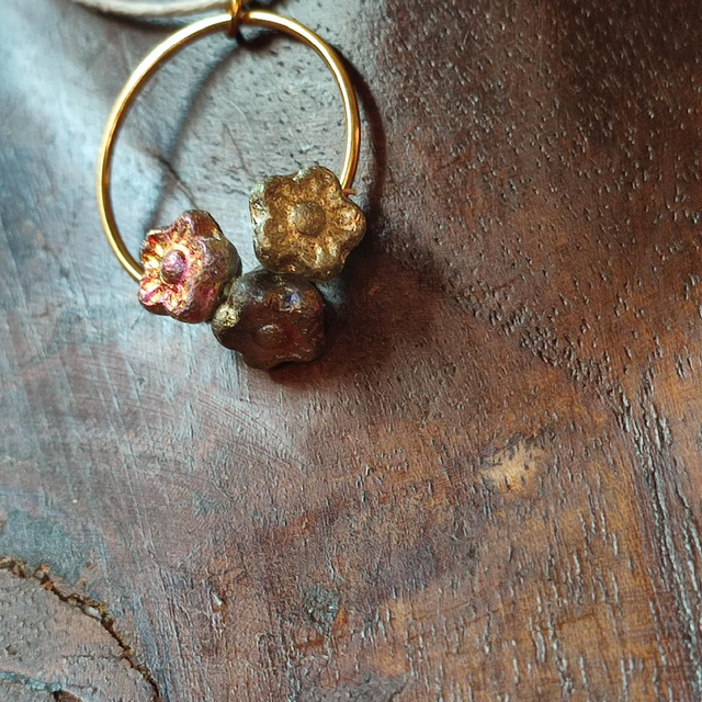 Collier fleurs en verre mordorées , monté sur fil de lin avec chaîne d'extension en acier inoxydable doré