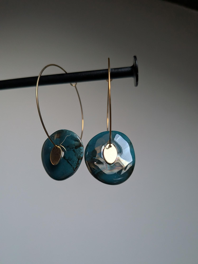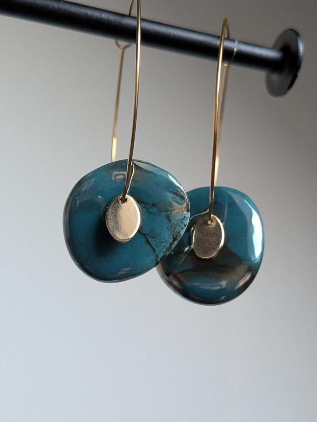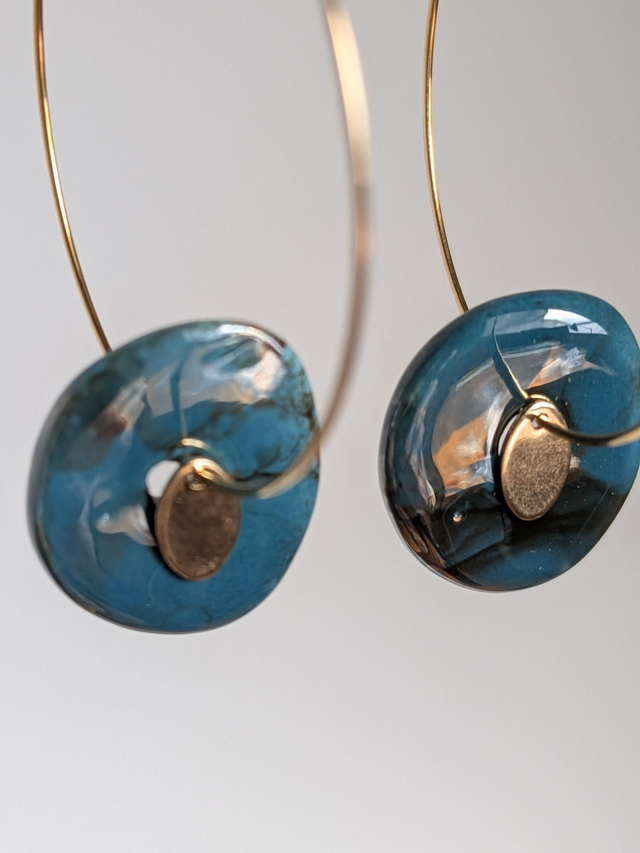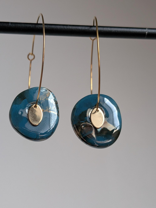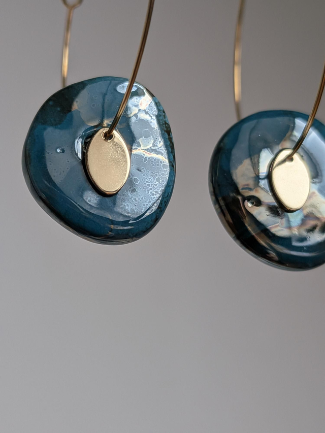 Créoles céramique " bleu paon" acier inoxydable doré -sans nickel, pièce unique