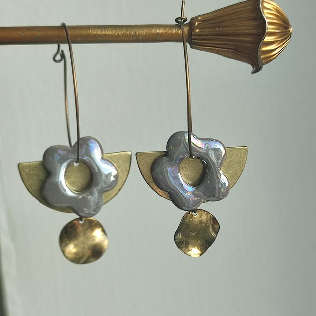 Créoles céramique fleurs grises laiton bronze-sans nickel, pièce unique