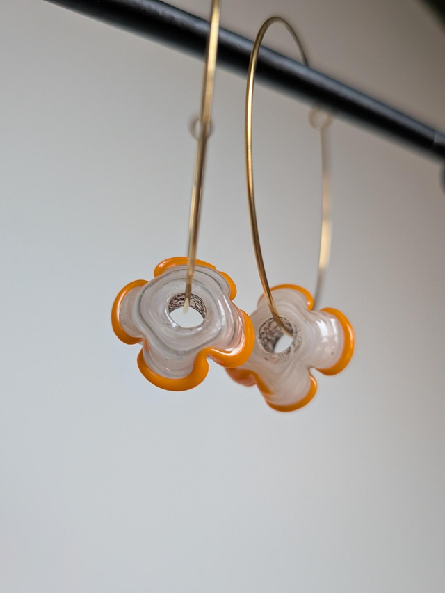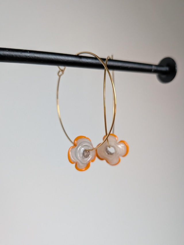 Créoles fleurs en verre artisanal transparent et orange, acier inoxydable argent -sans nickel -