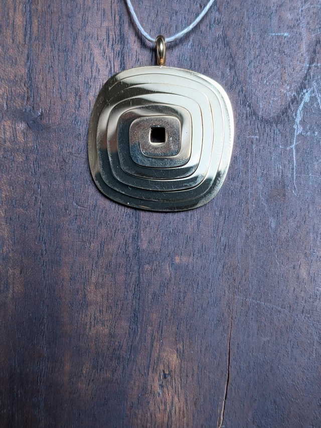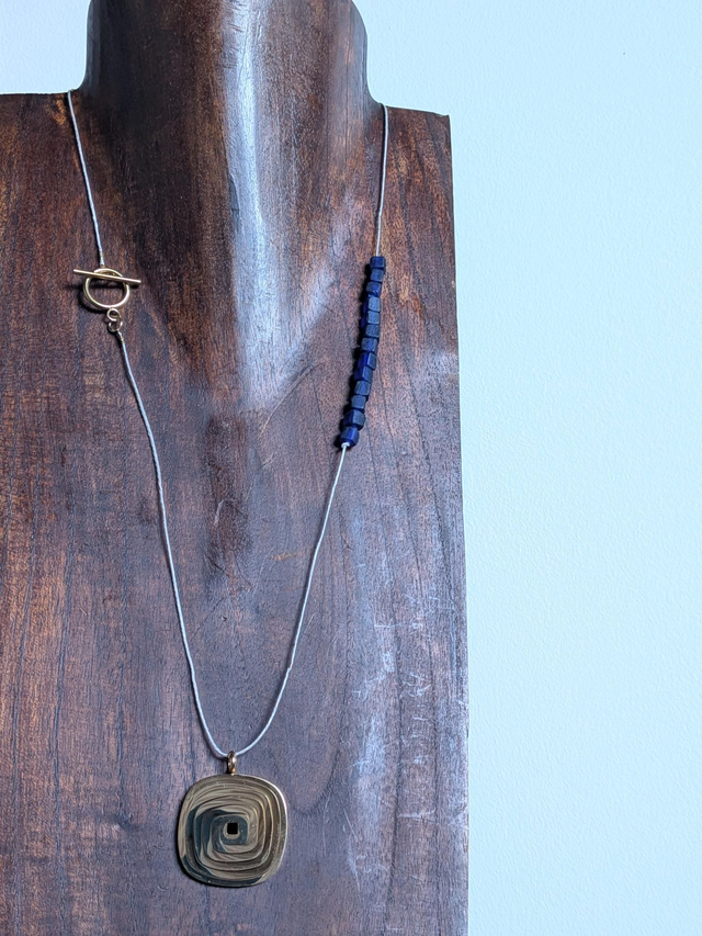 Cubes bleu marine, pendentif acier inoxydable doré monté sur fil de lin réglable, pièce unique