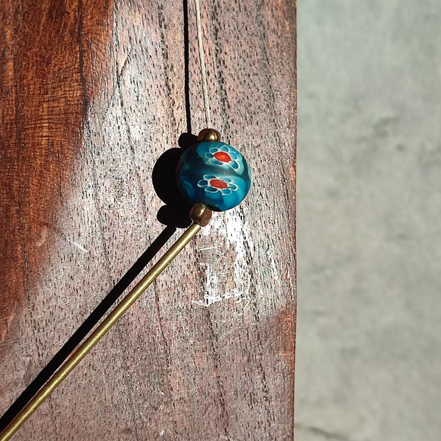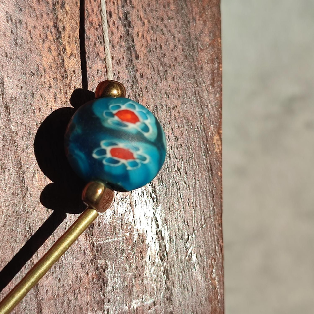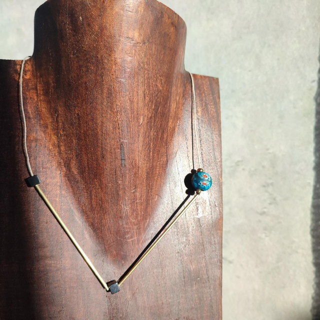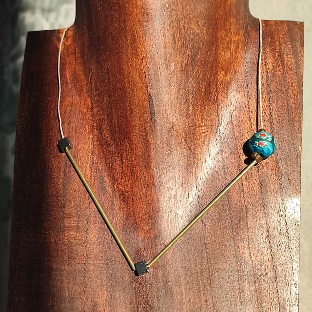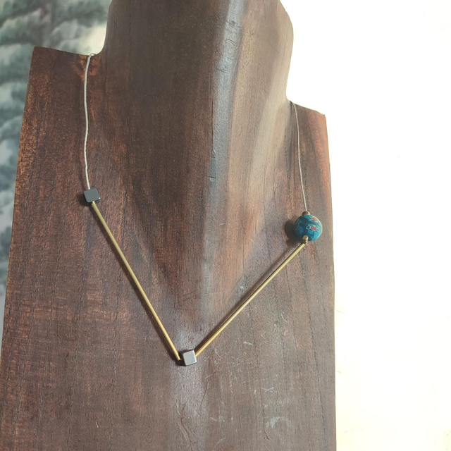 Cubes en hématite noire, perle fleurie turquoise et rouge,tiges dorées, collier monté sur fil de lin réglable avec chaîne d'extension, pièce unique