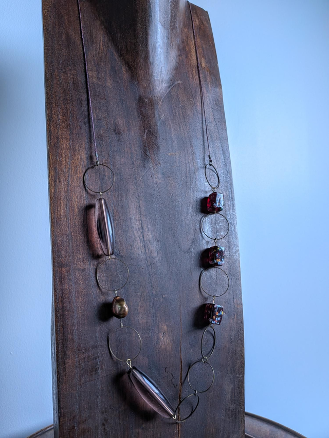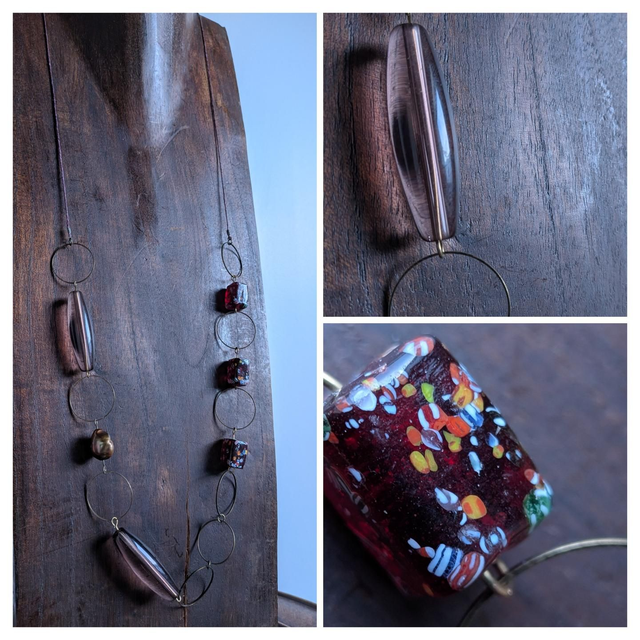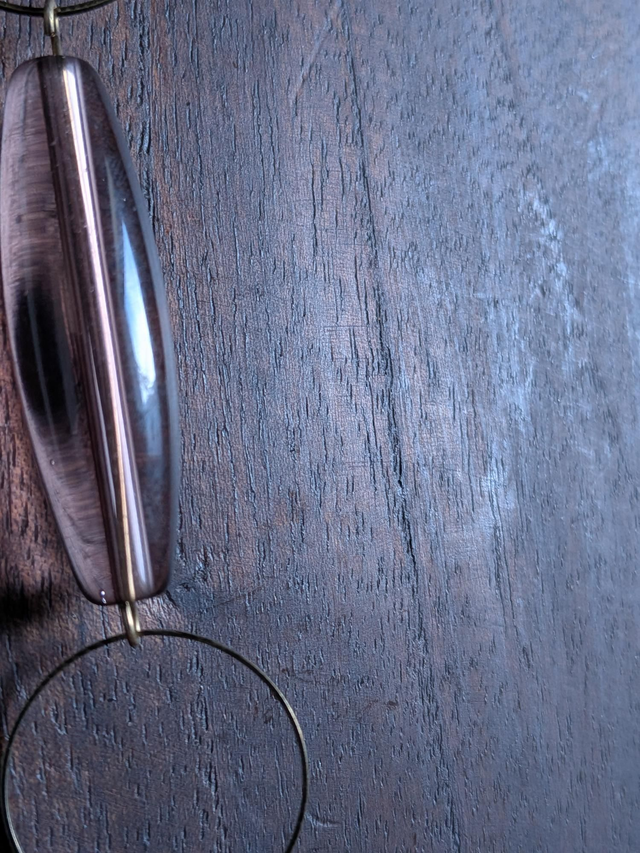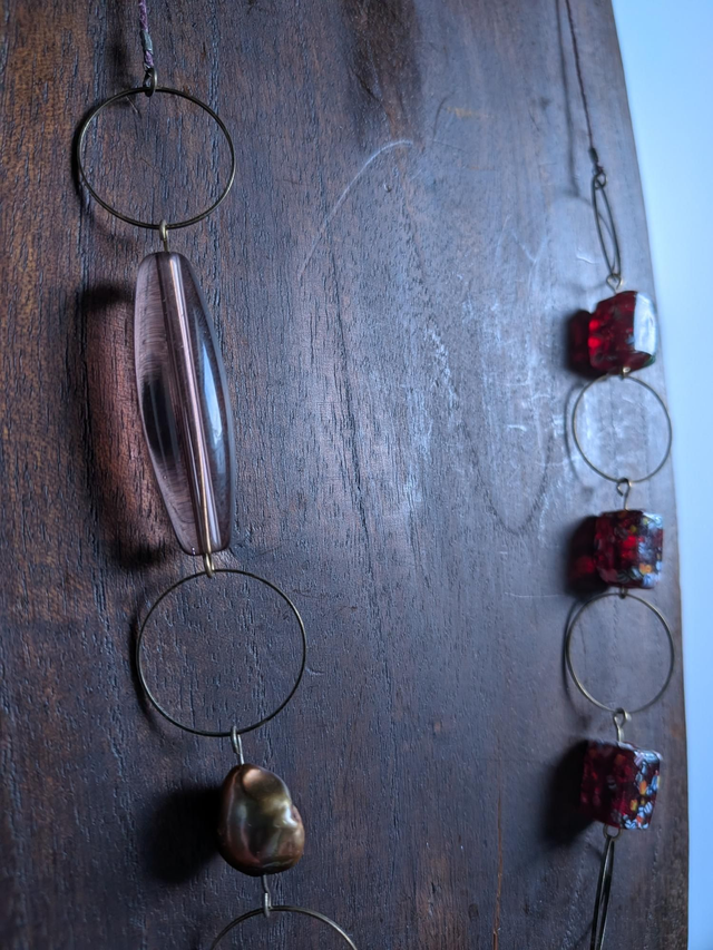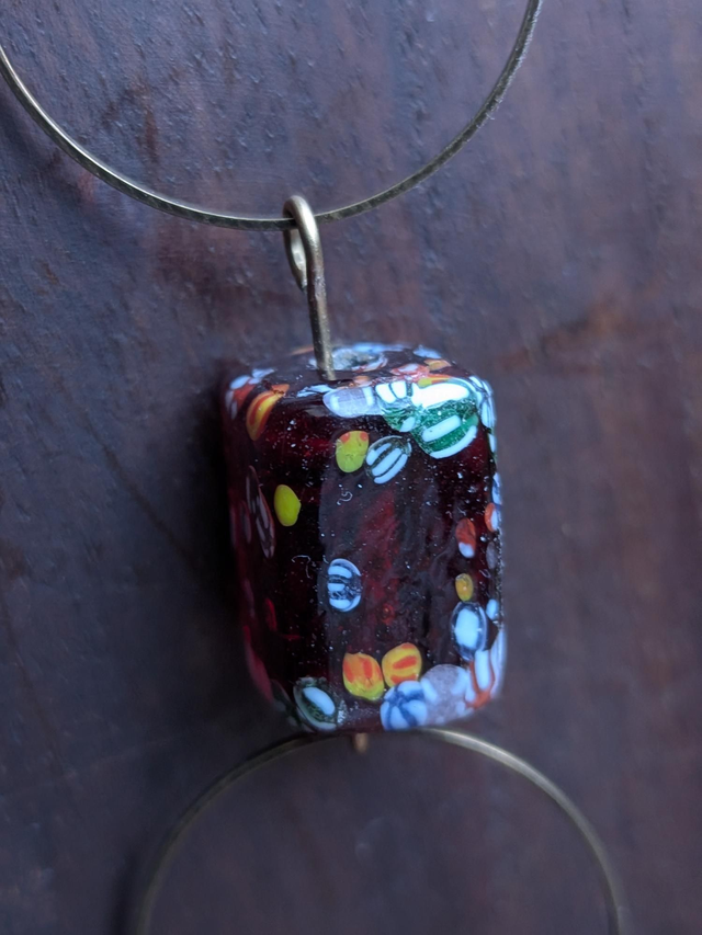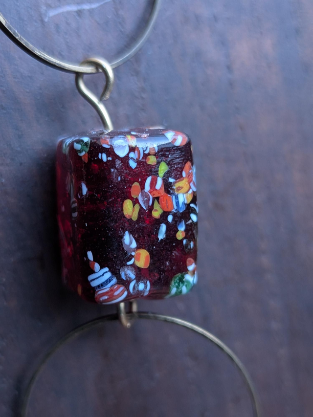 "Millefiori" cube prune , perles en verre transparent violine monté sur fil de lin réglable et résistant, pièce unique