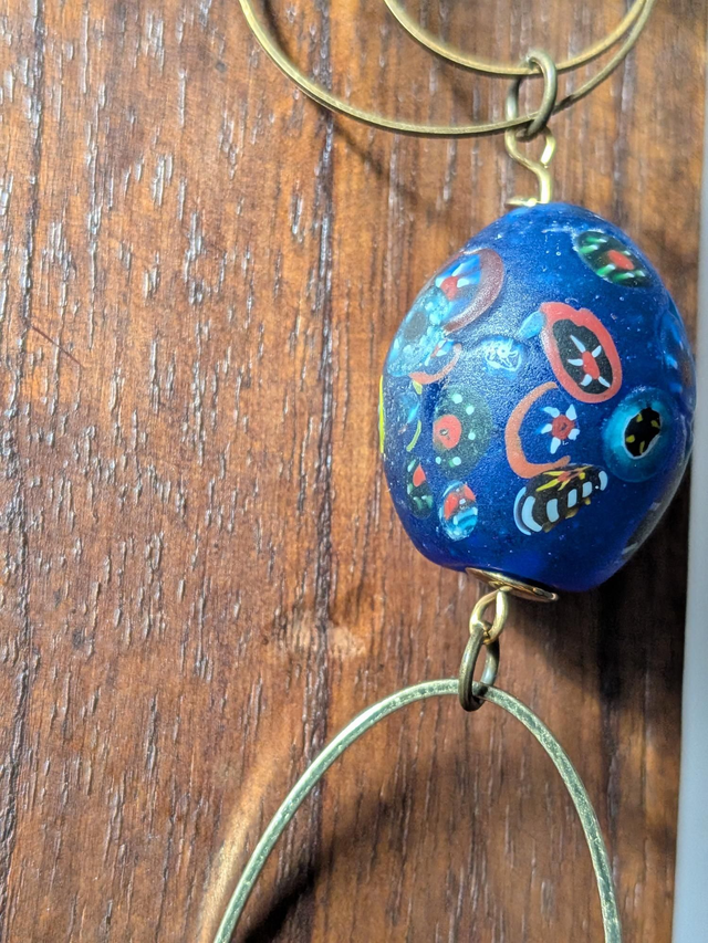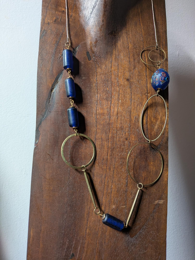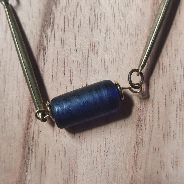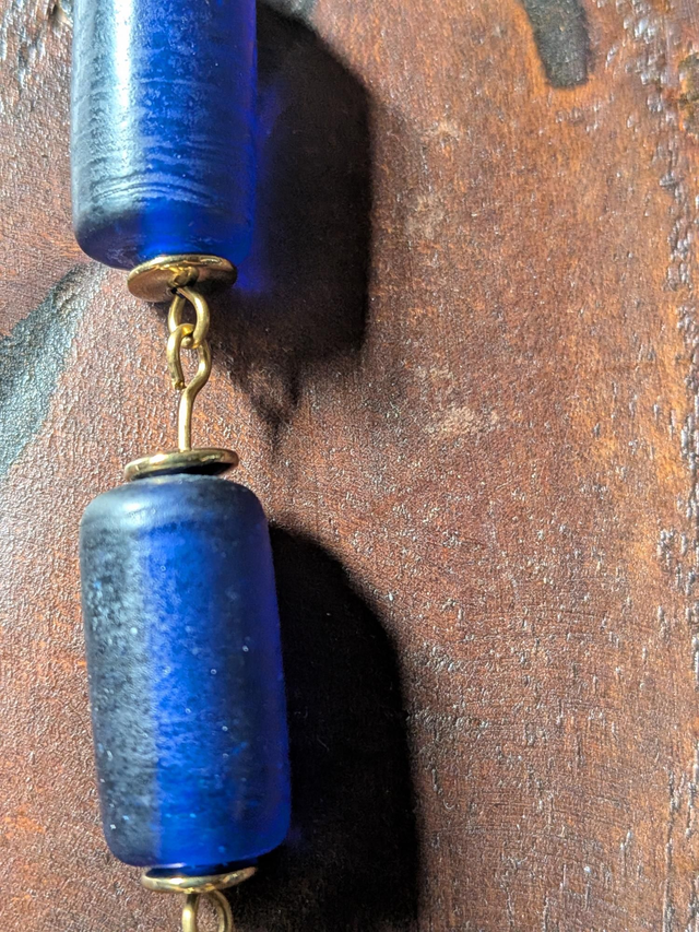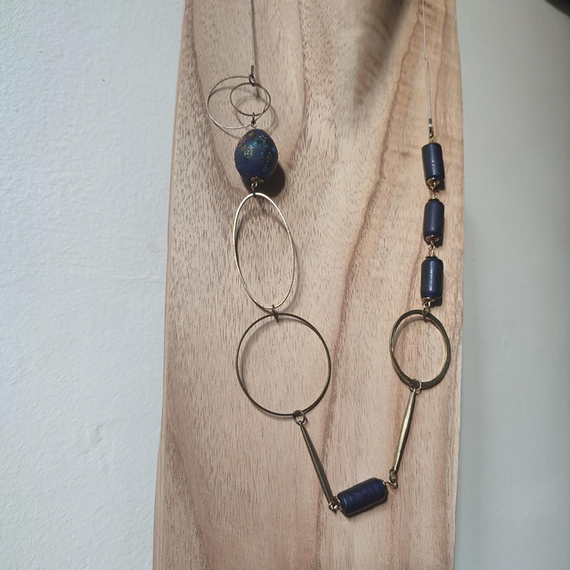 Sautoir verre "millefiori "bleu et verre mat , bronze, monté sur fil de lin réglable , pièce unique