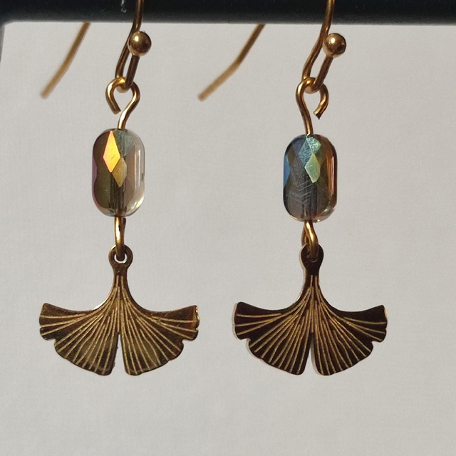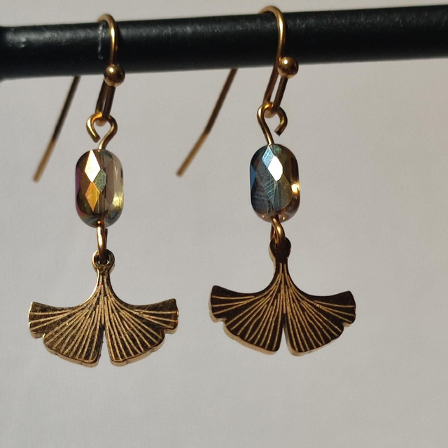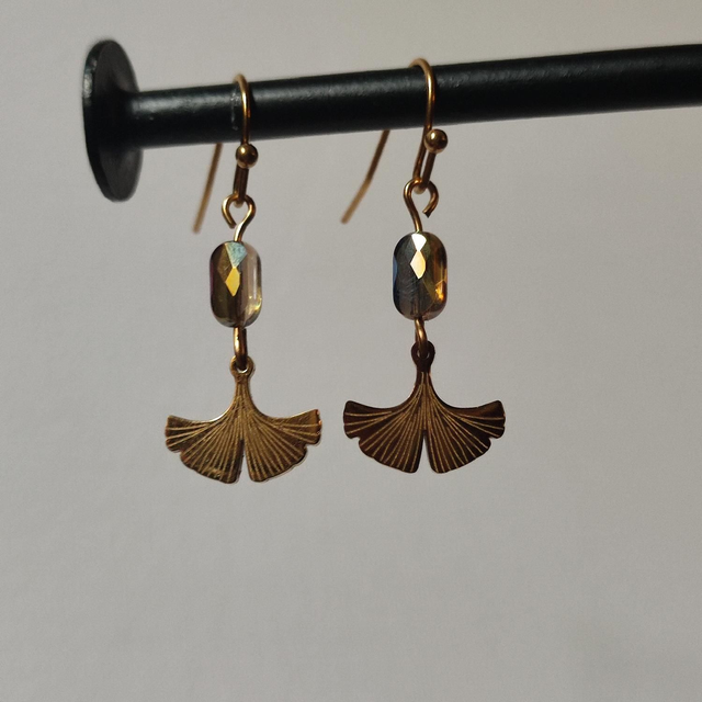 Boucles d'oreilles feuille de ginkgo et verre mordoré jolis reflets en acier inoxydable doré -sans nickel, pièce unique