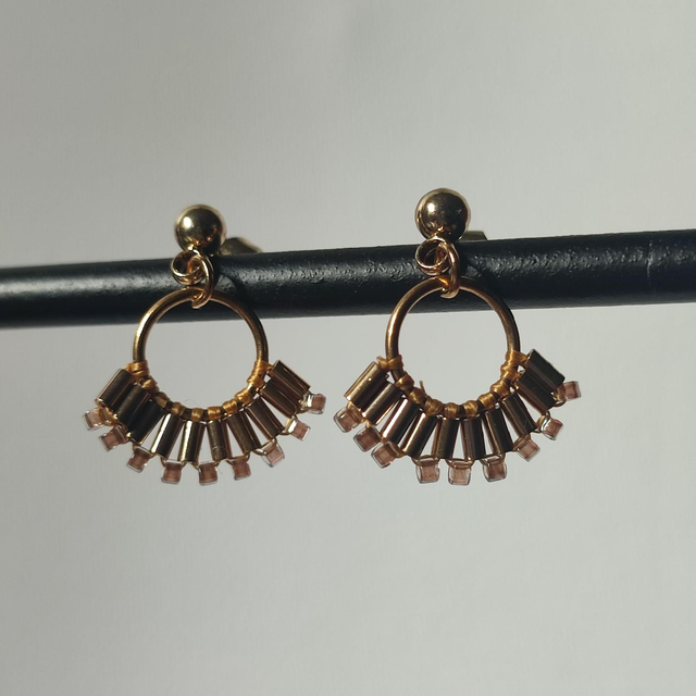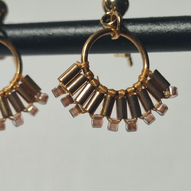 Boucles d'oreilles tissées main, perles de verre cuivre et or, en acier inoxydable doré -sans nickel, pièce unique