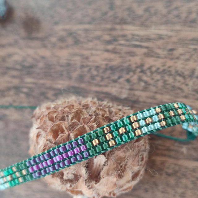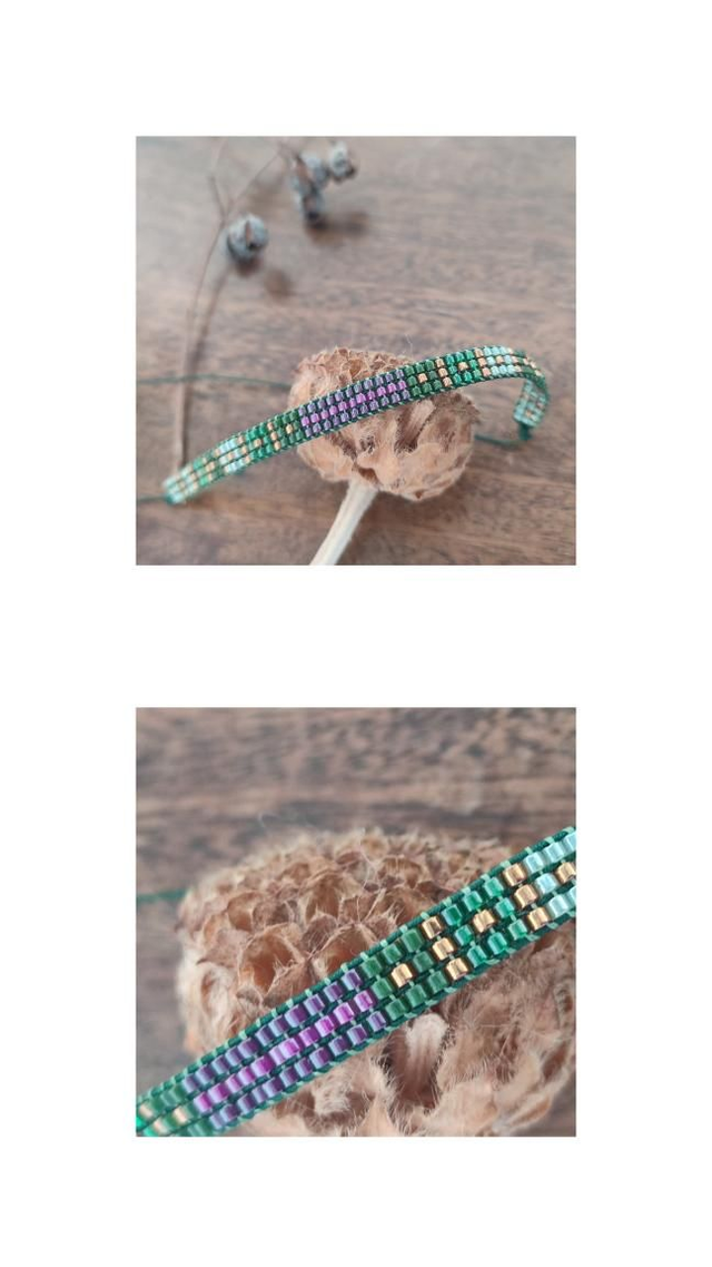 Bracelet carreaux vert et prune tissé main en perles de verre miyuki réglable et résistant, pièce unique