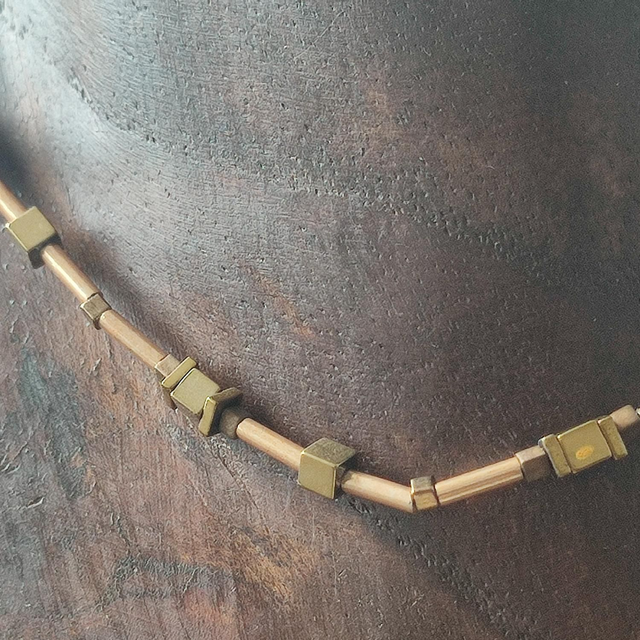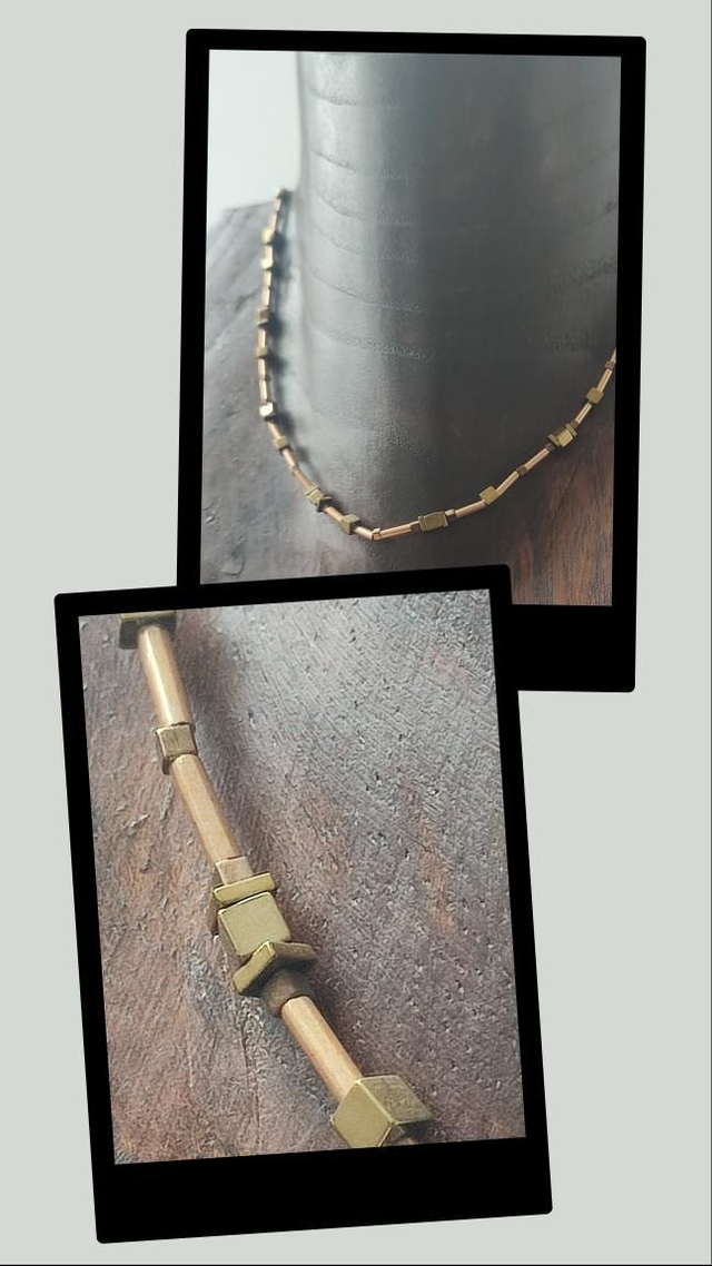 Collier en hématite doré :pierres naturelles de diverses formes, monté sur fil de jade, réglable avec chaîne d'extension, pièce unique