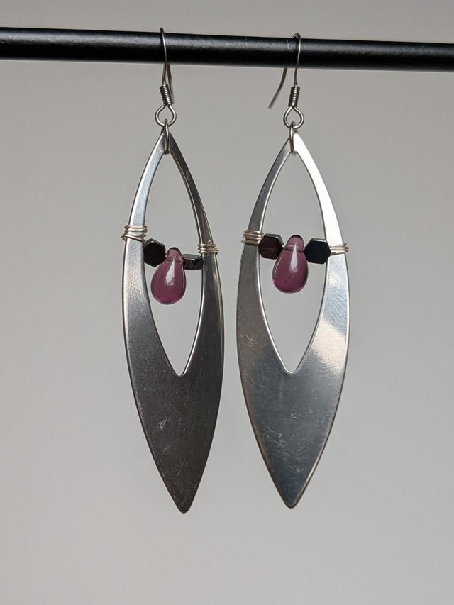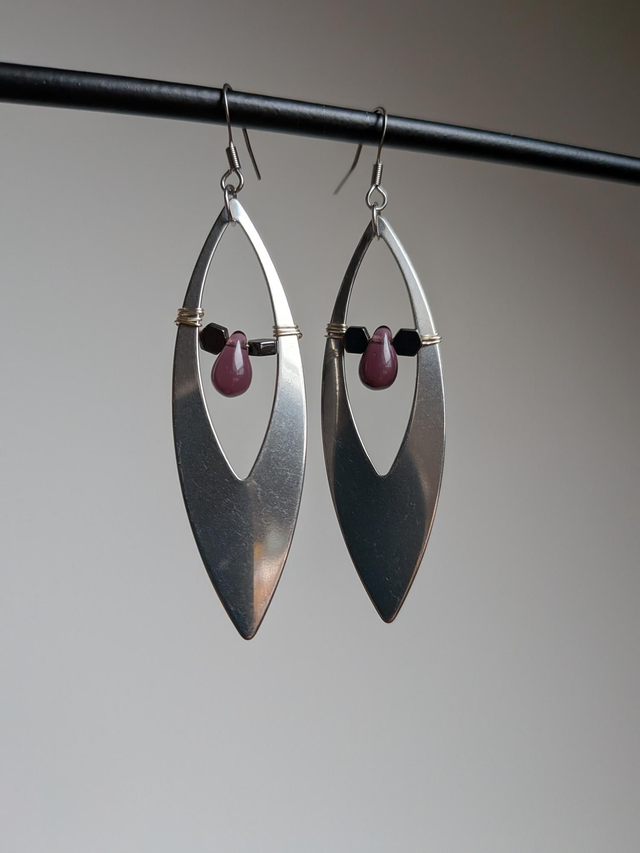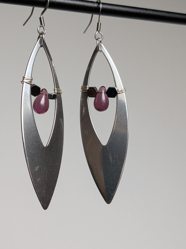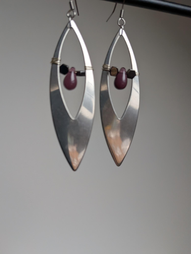 Boucles hématite noir et gouttes en verre violine, acier inoxydable argent pièce unique sans nickel